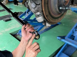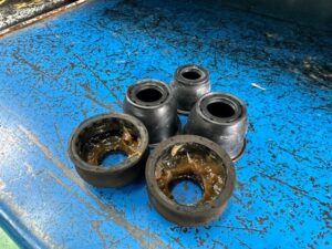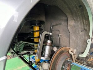 何時もの新品タイヤ、新品バッテリー、エンジンオイル、ブレーキフルード、ワイパーブレード交換、アライメント調整、スキャンツールによるエラーチェックと法定12ヶ月点検を実施致しました。また、リヤのリンクブーツの劣化が目立ちもしたので全て新品に交換させて頂き、そして、ユーザー様の拘りで純正Y字スポーク17インチホイールも4本新品を装着させて頂きました。