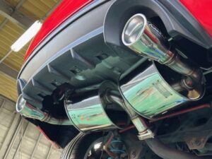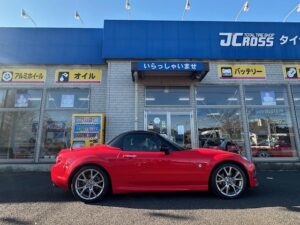 店頭に展示しておりました状態でそれなりにカスタマイズされていた車両でしたが、更にユーザーのご希望で、ドアミラーの鏡部を新品に、また、マフラーもオートエグゼ製に交換、その他何時も通りタイヤをはじめエンジンオイル等も交換、アライメント調整とOBD2テスターエラーチェックで仕上げました。