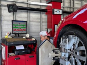 仕上げに、アライメントテスターで足回りチェック、24ヶ月点検を実施致しまして車検検査ライン通過準備完了。